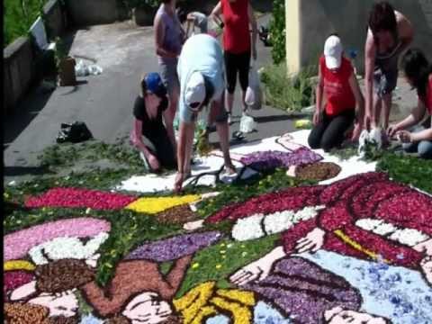CINQUEFRONDI – Senza nessuna organizzazione preliminare, all’ultimo momento, solo per dare a tutti la possibilità di assistere anche da lontano alle fasi di preparazione dell’”Infiorata 2012″, abbiamo registrato in presa diretta, senza alcuna particolare elaborazione e con l’audio integrale, le fasi di preparazione delle realizzazioni floreali disseminate su tutte le vie del percorso cittadino che la Processione del Santissimo tra qualche minuto attraverserà. Lo scenario, quest’anno è la parte alta del paese. Queste le vie interessate al percorso dopo l’uscita dalla Chiesa matrice: Via Indipendenza, via Savoia, Via Tocco, Via Leopardi, Via Corrado Alvaro, Via De Gasperi, Via Bulzomì, Via Dante, Via Bivieri, Via Cavour, Corso Garibaldi, scalinata della chiesa matrice da piazza della Repubblica. Bambini, ragazzi, giovani, adulti, anziani, centinaia di persone di ogni età intenti chi a preparare il materiale, chi a disegnare, chi ad allestire le immagini con una miriade di materiali diversi e con quello principe e protagonista, i petali di fiori di ogni tipo grandezza, qualità e colore. Abbiamo deciso di spezzare i due momenti, quello della preparazione da quello della processione e di riversare in rete, quasi in tempo reale ed in una finta diretta, una leggera differita se si considera che l’orologio della torre civica segna, all’ inizio delle operazioni, le ore 14:55 ed il filmato viene immesso in rete alle 18:30. Le immagini sono del nostro piccolo collaboratore Gabriele e della sua nuova camera compatta, la breve e semplice elaborazione è di Francesco. Ve le proponiamo, Buona visione